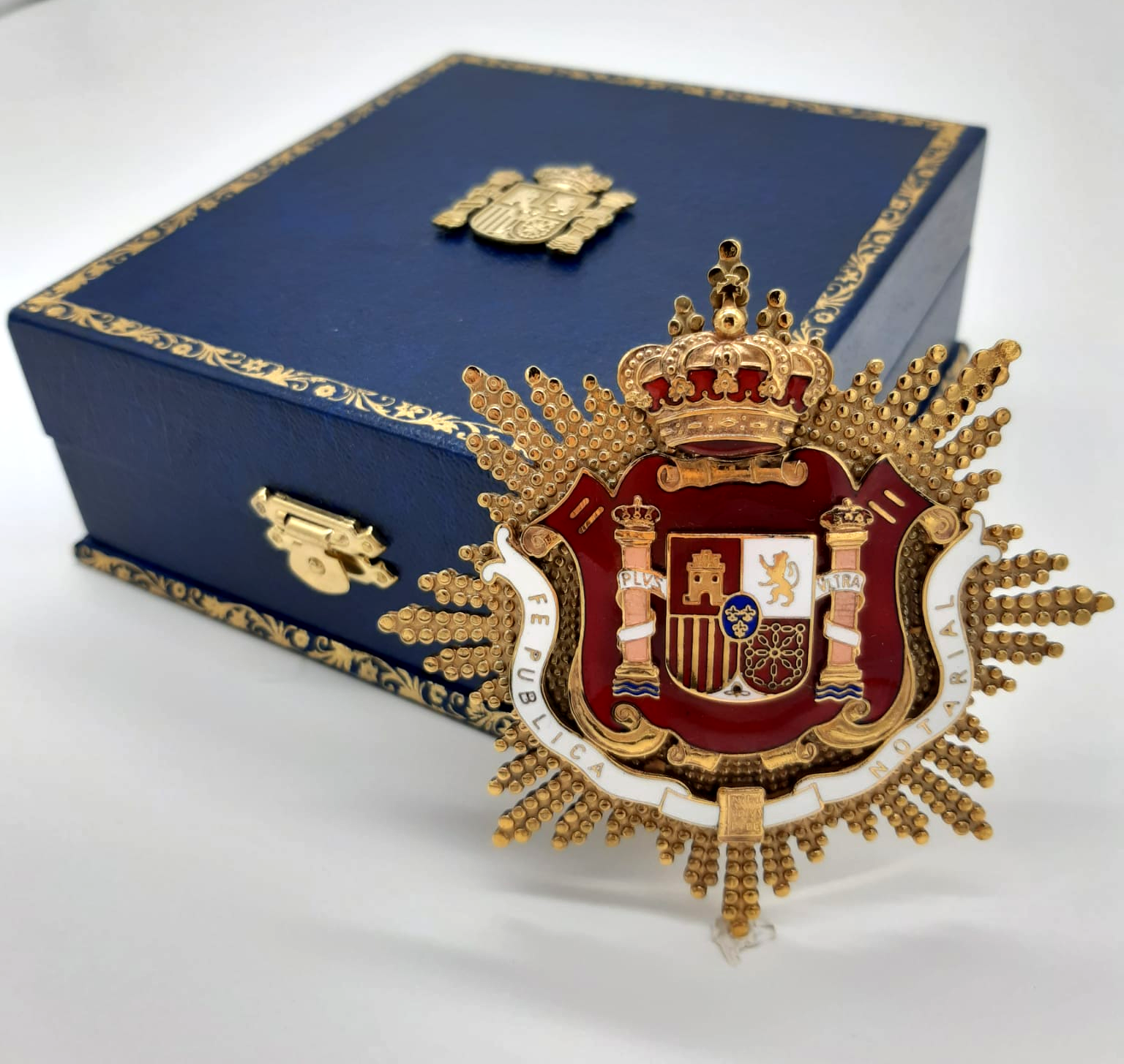Es una pieza única de orfebrería realizada a mano en oro, plata y materiales de máxima calidad (también disponible en otros metales) y esmaltadas a fuego. Es una joya para toda la vida. Se entregan en un estuche de lujo hecho a mano exclusivo de JUDEX que sirve de expositor para cuando no se esté usando en actos oficiales. La placa incorpora la leyenda: "FE PÚBLICA NOTARIAL".